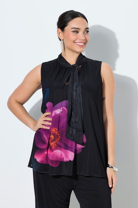 Blusentop, ärmellose A-Linie, doppellagig. Feiner Crepe mit Blütenmotiv. Stehkragen mit V-Ausschnitt und Schluppe zum Binden. Darunter blickdichtes Jerseytop.