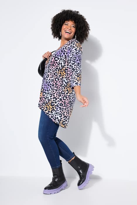 T-Shirt, Leomuster, 3/4-Ärmel, Saum hinten länger